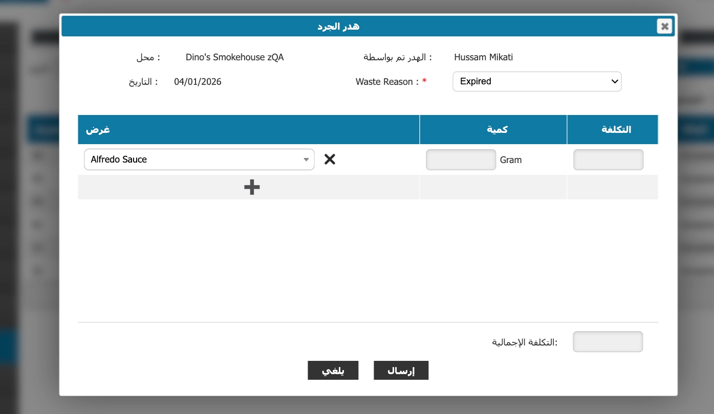 - إنشاء وتعديل وتتبع أسباب الهدر (مثل: انسكاب، تلف/انتهاء الصلاحية، خطأ في التحضير)